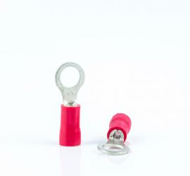 Our range of ring terminals consists entirely of insulated versions. These are made of a copper connector and an insulating PVC sleeve. The sleeve provides additional safety by preventing short circuits and electric shocks, and it protects the fine strands of the cable from damage.
