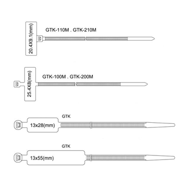 There are four types of cable ties with marker label - see the image below. Each of these variants is available in multiple sizes and in the colours black and natural. Black cable ties with marker labal are UV resistant.